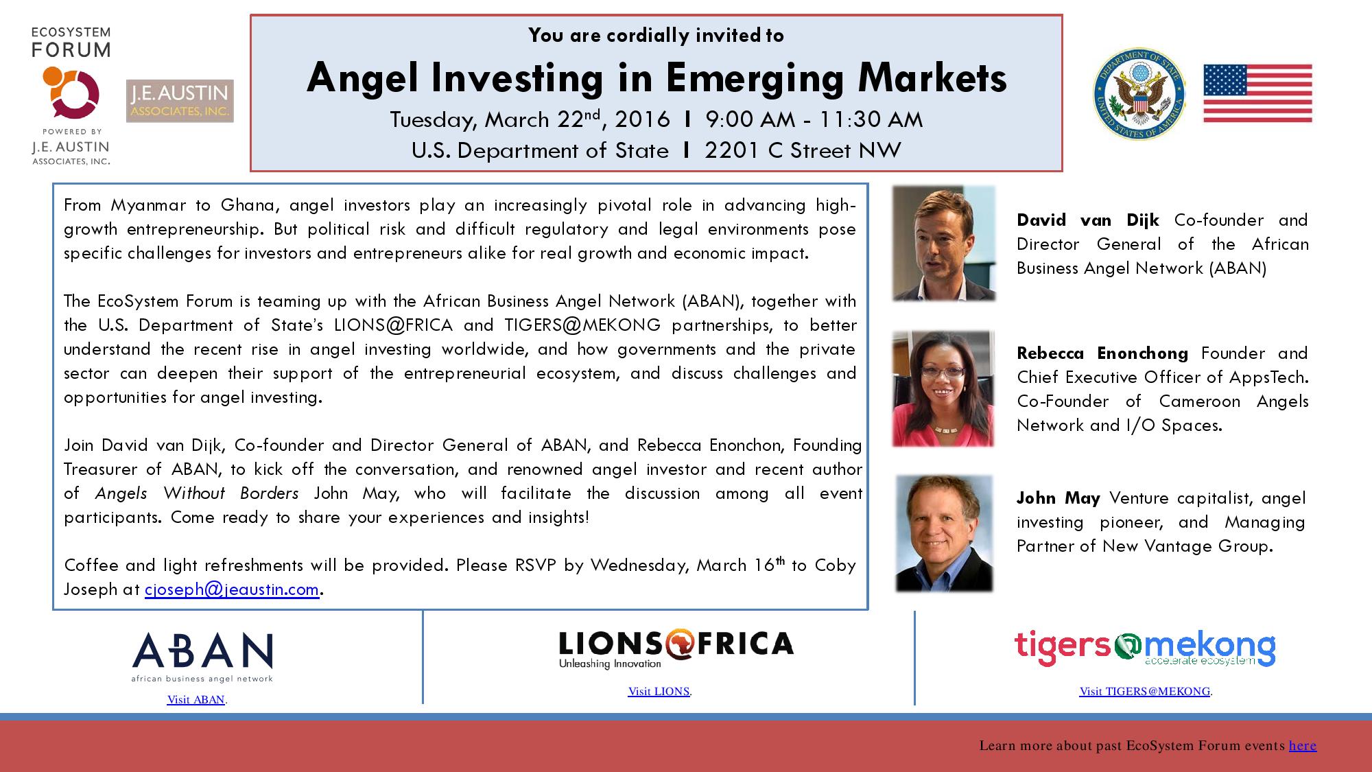 On March 22, 2016, The  EcoSystem Forum, ABAN Angels, U.S. Dept Of State’s LionsAfrica & TIGERS@MEKONG hosted a investing in Africa event in Washington DC at the U.S. Department Of State’s office.