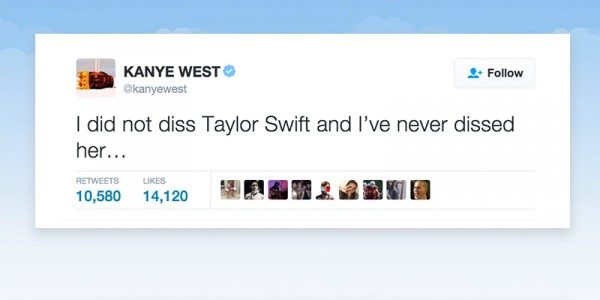 Mind you the people he offended consisted of that artist that had a cumulative following of 100 million users on Twitter. Although Taylor Swift never responded to Kanye’s diss, her fan base, her brother and media outlets responded on her behalf.